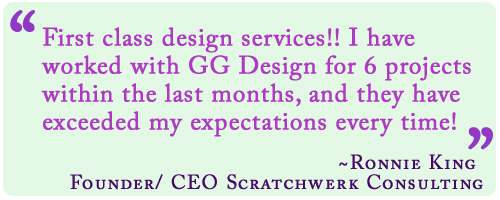 "First class design services!! I have worked with GG Design for 6 projects within the last few months, and they have exceeded my expectations every time! From ad designs and letterheads, to newsletter mock-ups and promotional fliers. I have felt comfortable knowing that GG Design will produce exactly what we are looking for. AND ON TIME!! Thank you for all the great work, and I look forward to working with you many more times in the future!"